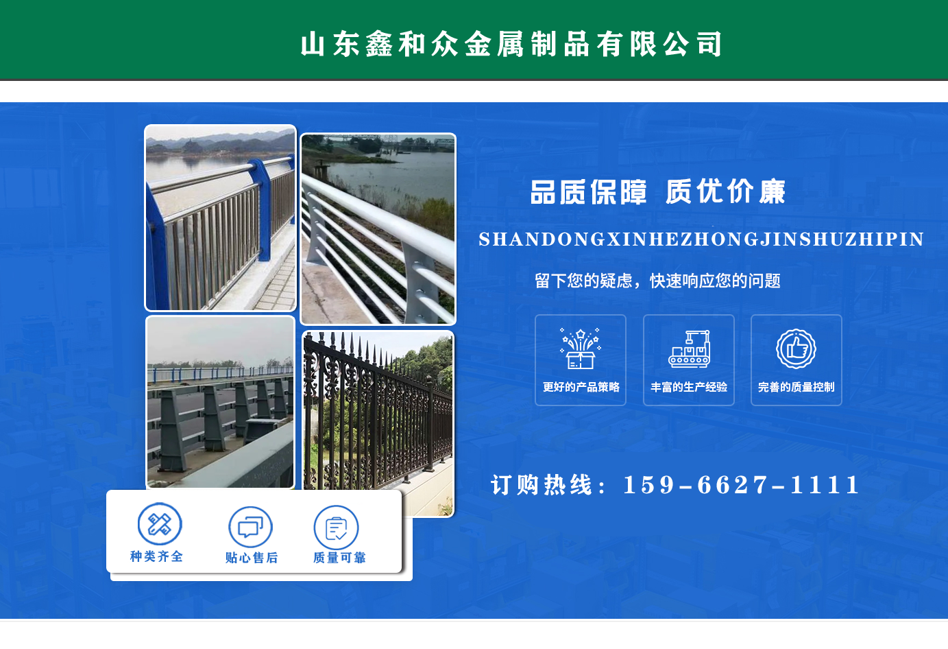 山東鑫和眾金屬制品有限公司主要產(chǎn)品有防撞護欄,橋梁護欄,道路護欄,河道護欄,不銹鋼護欄等護欄。提供設(shè)計方案,一站式定制,包您滿意價格優(yōu)惠,歡迎來電咨詢! 公司常年從事銷售護欄防撞護欄,橋梁護欄,道路護欄,河道護欄,不銹鋼護欄,橋梁鋼護欄,河道燈光護欄等。產(chǎn)品廣泛應(yīng)用于橋梁、河道、旅游景區(qū)、道路、公路、公園、小區(qū)、景觀、道路防撞等領(lǐng)域。 公司產(chǎn)品均采用優(yōu)質(zhì)不銹鋼材料,符合相關(guān)標準。各種型號不銹鋼復合管及護欄,質(zhì)量嚴格把控。產(chǎn)品強度高、耐腐蝕、焊接牢固、抗沖擊、性能好,防撞護欄結(jié)構(gòu)簡單、美觀實用大方?! g迎前來訂購!...